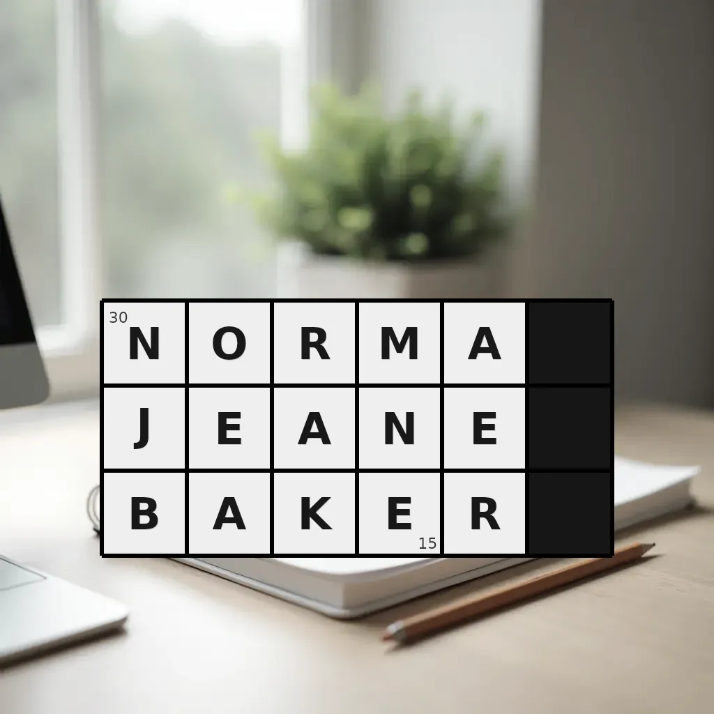 Słowo „norma jeane baker” ma 15 znaków (bez spacji i łączników).