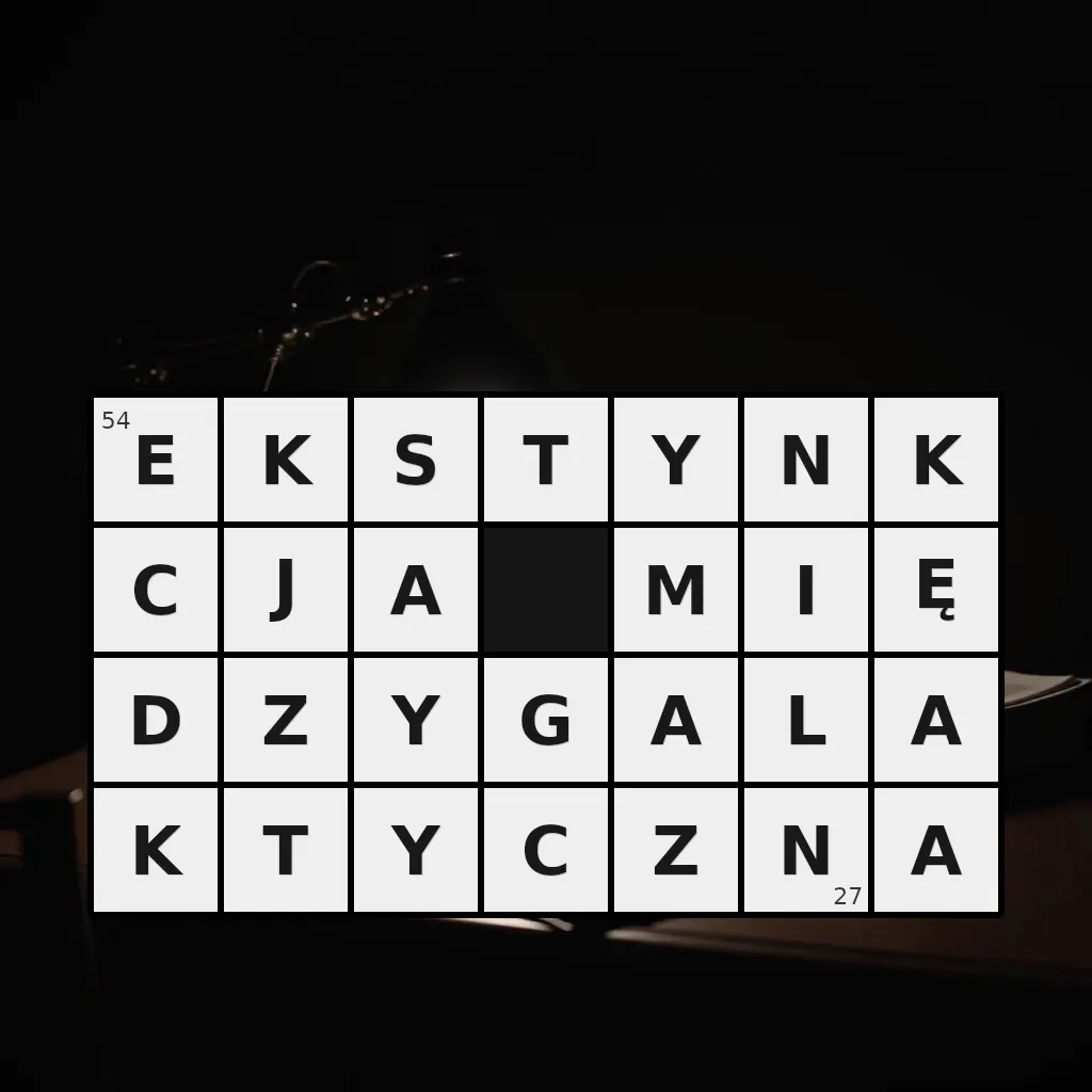 Zawiera litery: A, A, A, A, C, C, D, E, G, I, J, K, K, K, L, M, N, N, S, T, T, Y, Y, Y, Z, Z, Ę