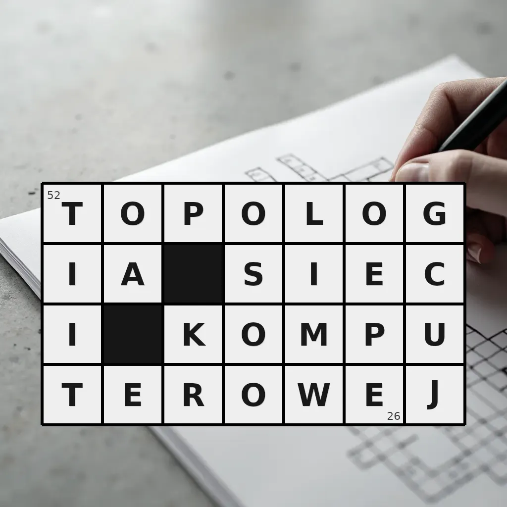 Słowo „topologia sieci komputerowej” ma 26 znaków (bez spacji i łączników).