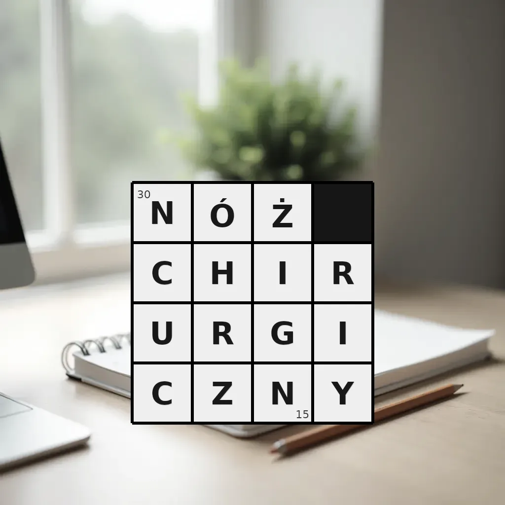 Słowo „nóż chirurgiczny” ma 15 znaków (bez spacji i łączników).