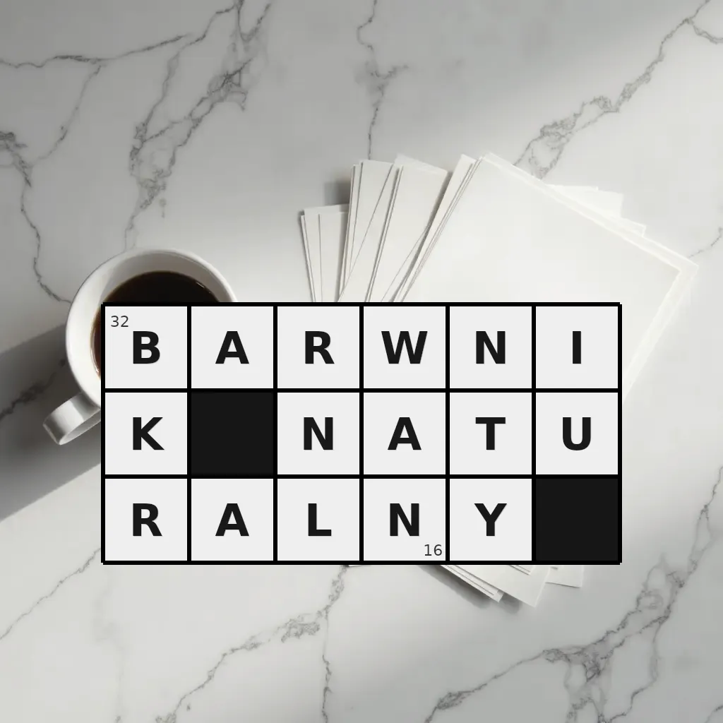 Słowo „barwnik naturalny” ma 16 znaków (bez spacji i łączników).