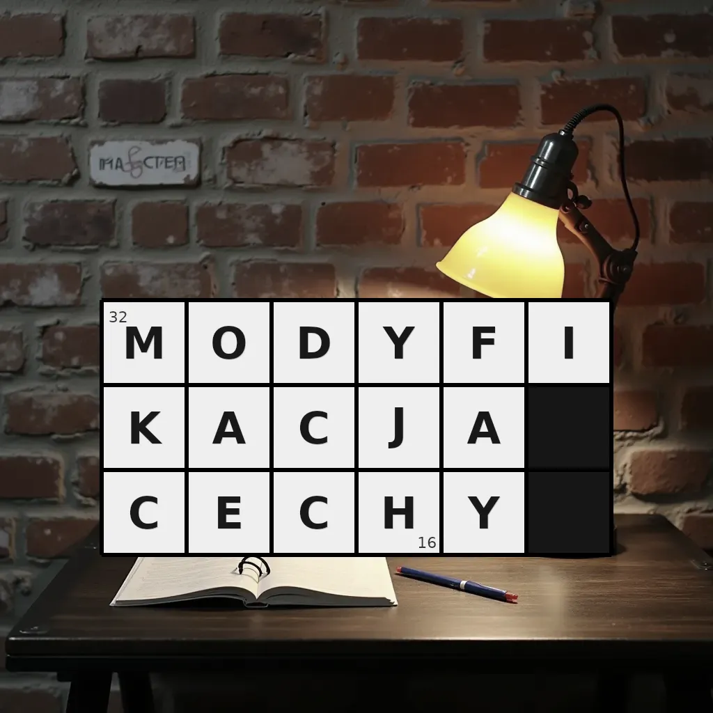 Słowo „modyfikacja cechy” ma 16 znaków (bez spacji i łączników).