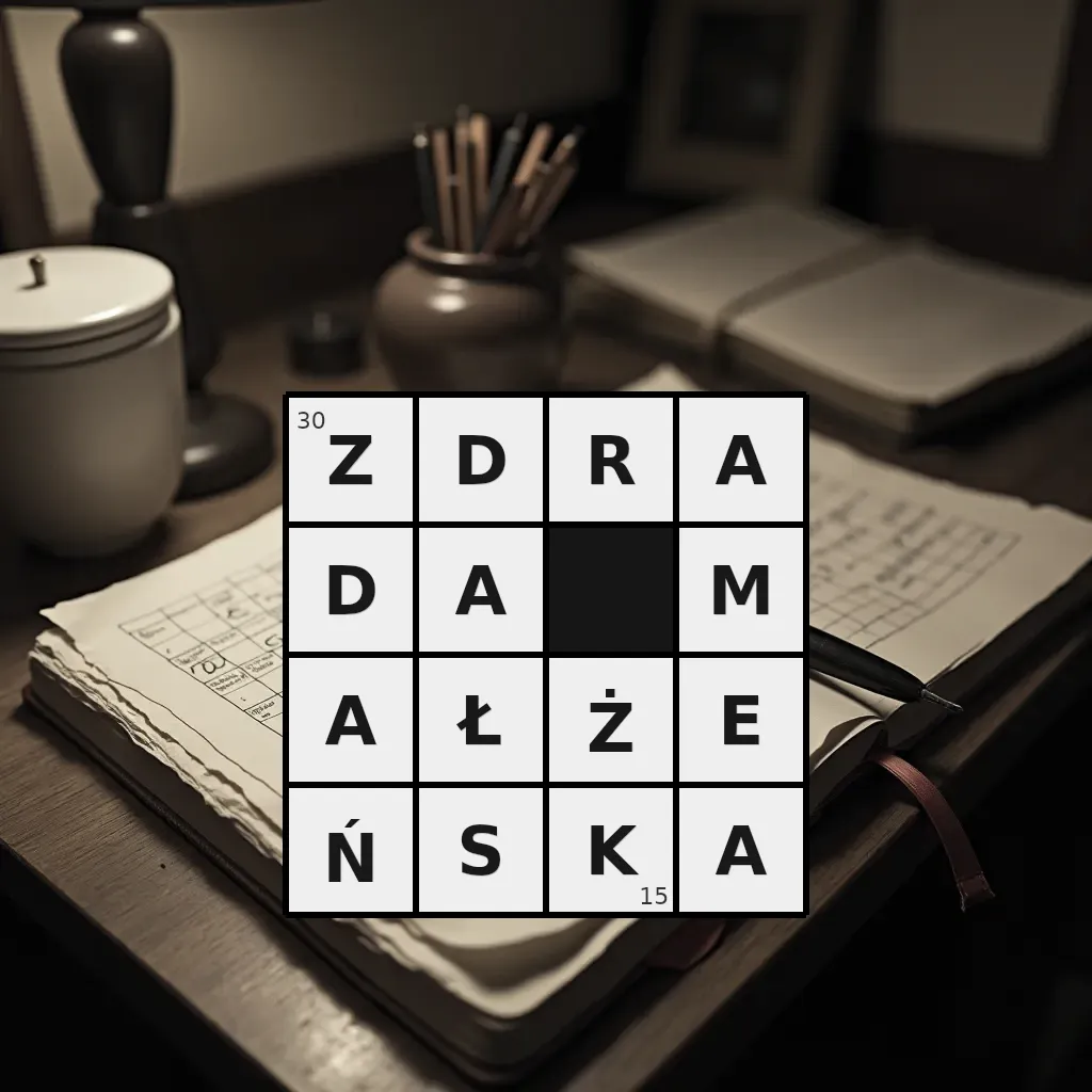 Słowo „zdrada małżeńska” ma 15 znaków (bez spacji i łączników).
