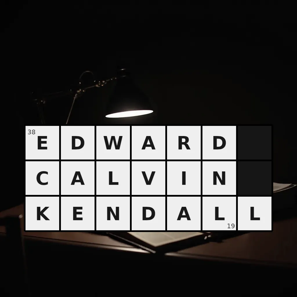 Słowo „edward calvin kendall” ma 19 znaków (bez spacji i łączników).