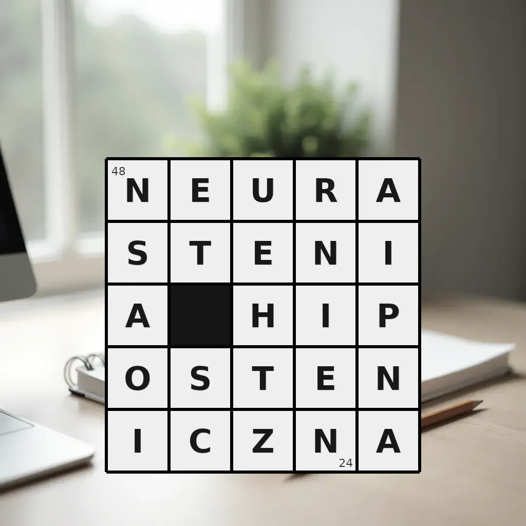 Słowo „neurastenia hiposteniczna” ma 24 znaki (bez spacji i łączników).