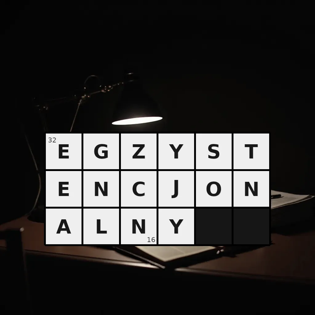Słowo „egzystencjonalny” ma 16 znaków (bez spacji i łączników).