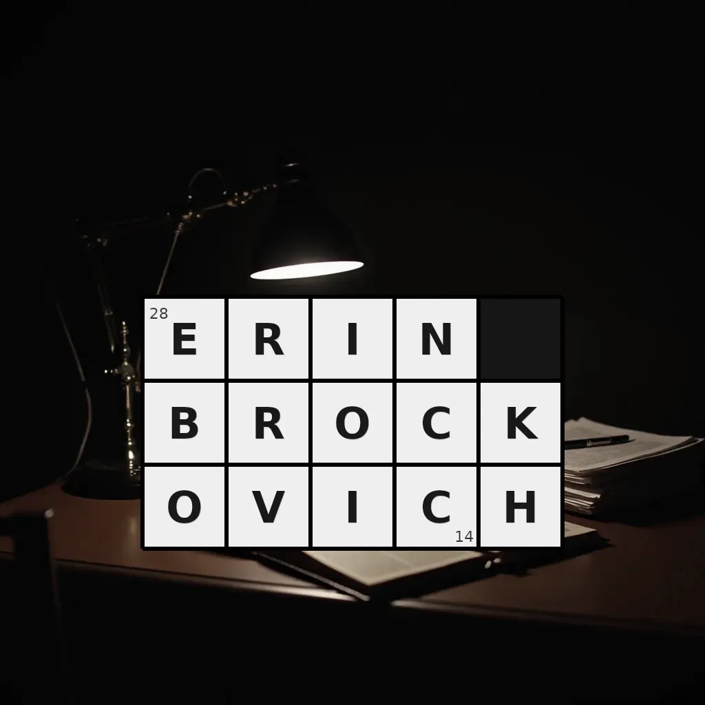 Słowo „erin brockovich” ma 14 znaków (bez spacji i łączników).
