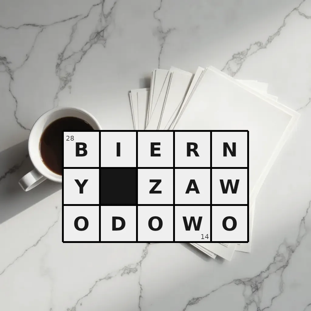 Zawiera litery: A, B, D, E, I, N, O, O, O, R, W, W, Y, Z