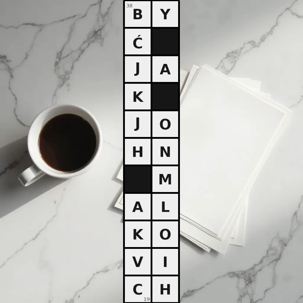 Zawiera litery: A, A, B, C, H, H, I, J, J, K, K, L, M, N, O, O, V, Y, Ć