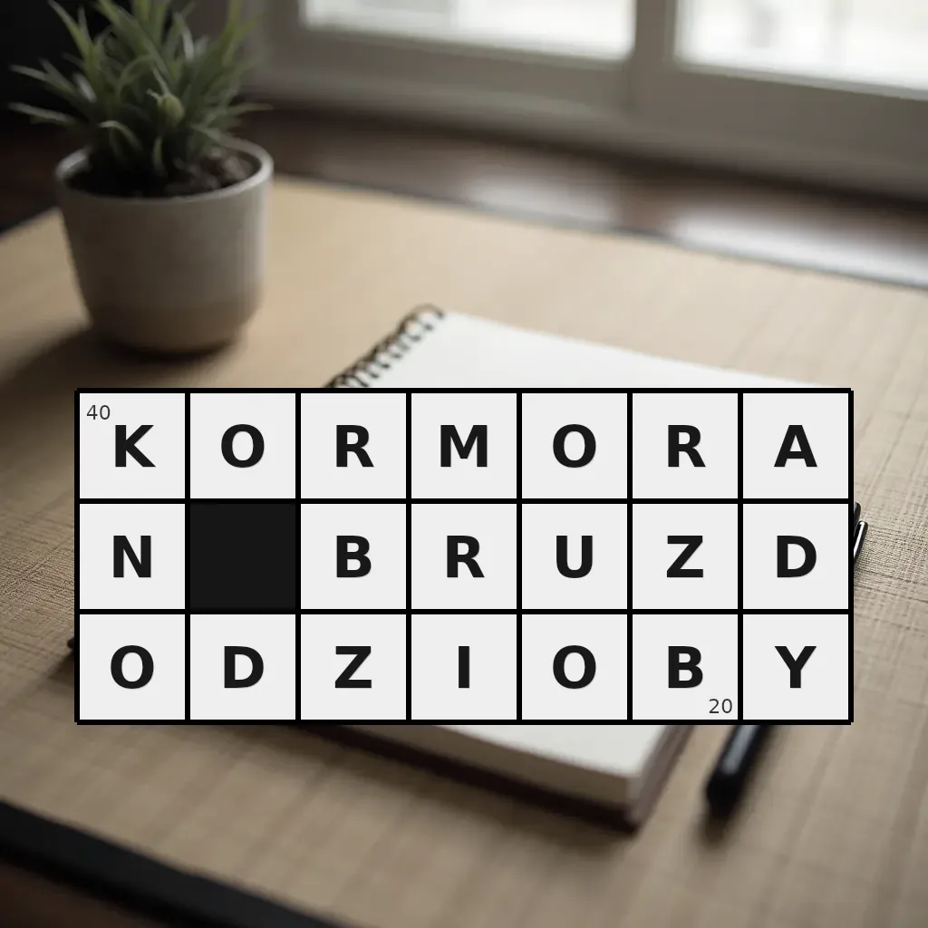 Słowo „kormoran bruzdodzioby” ma 20 znaków (bez spacji i łączników).