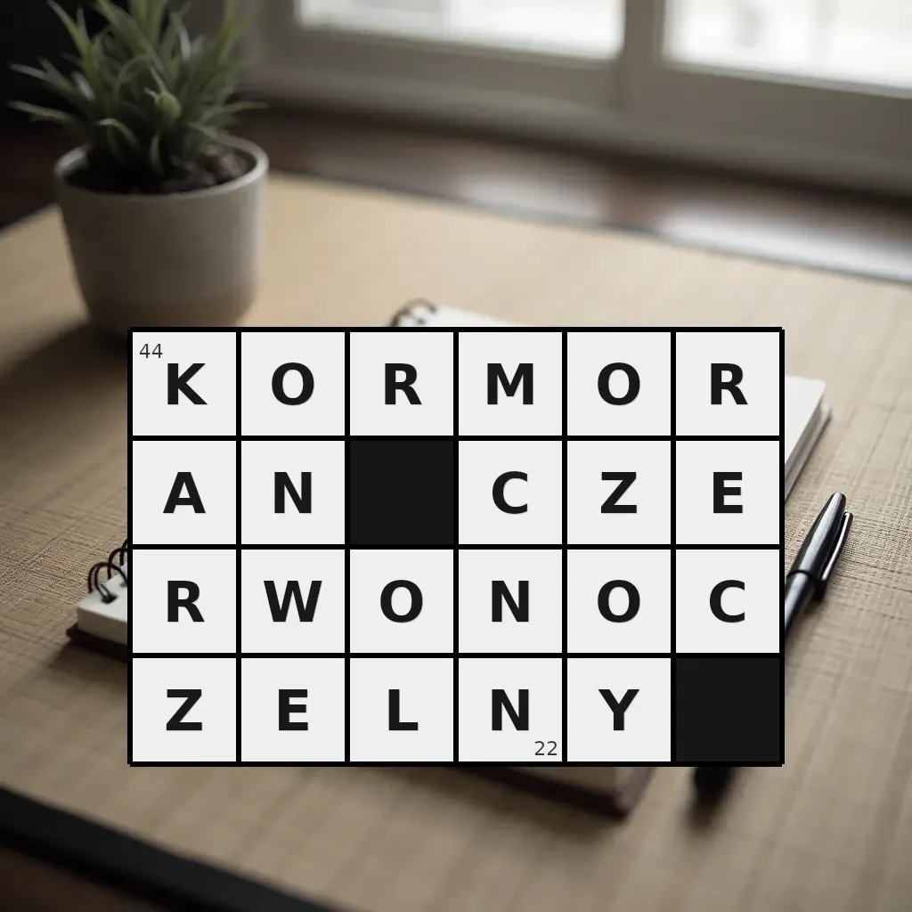 Słowo „kormoran czerwonoczelny” ma 22 znaki (bez spacji i łączników).