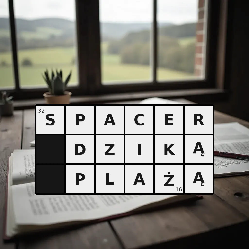Słowo „spacer dziką plażą” ma 16 znaków (bez spacji i łączników).