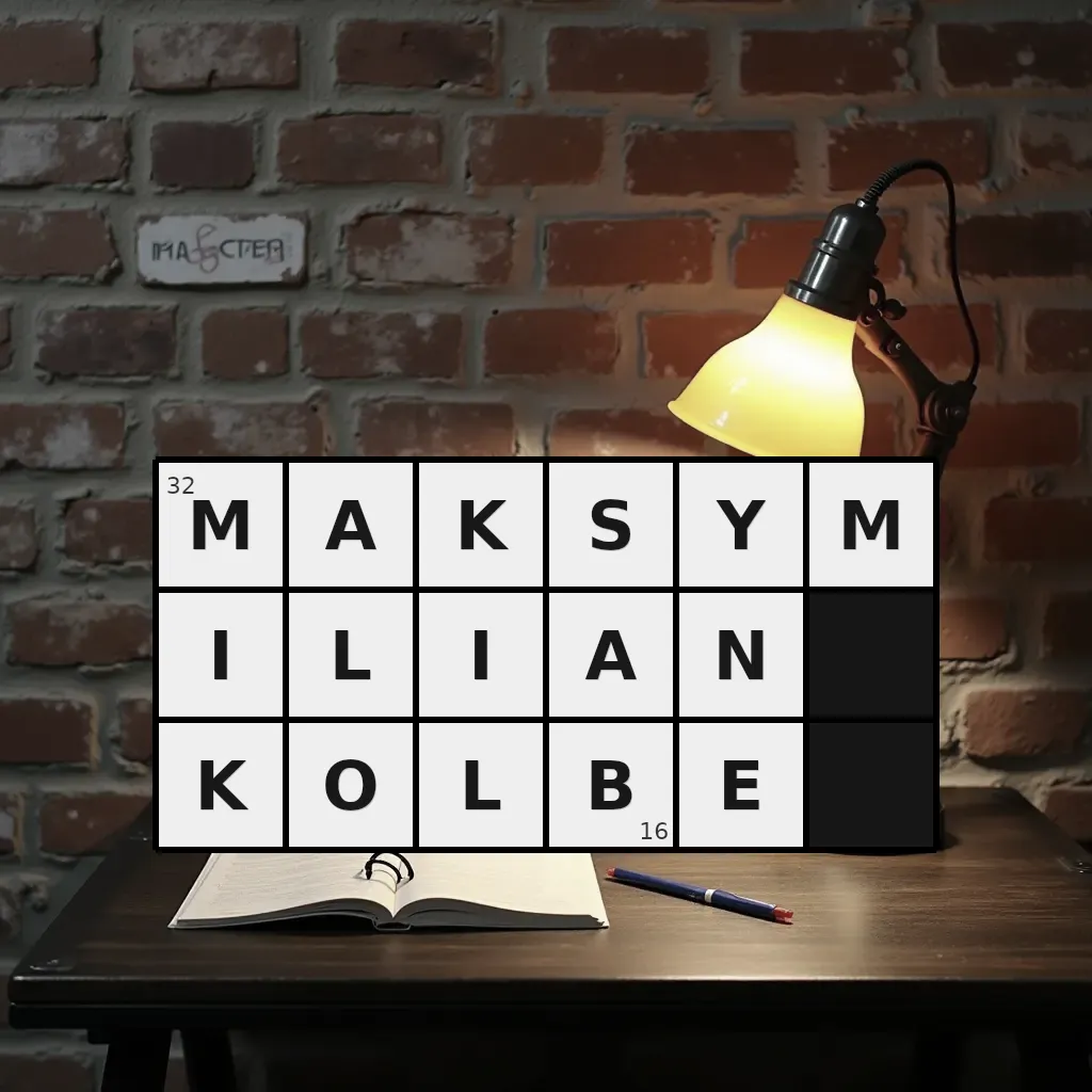 Słowo „maksymilian kolbe” ma 16 znaków (bez spacji i łączników).