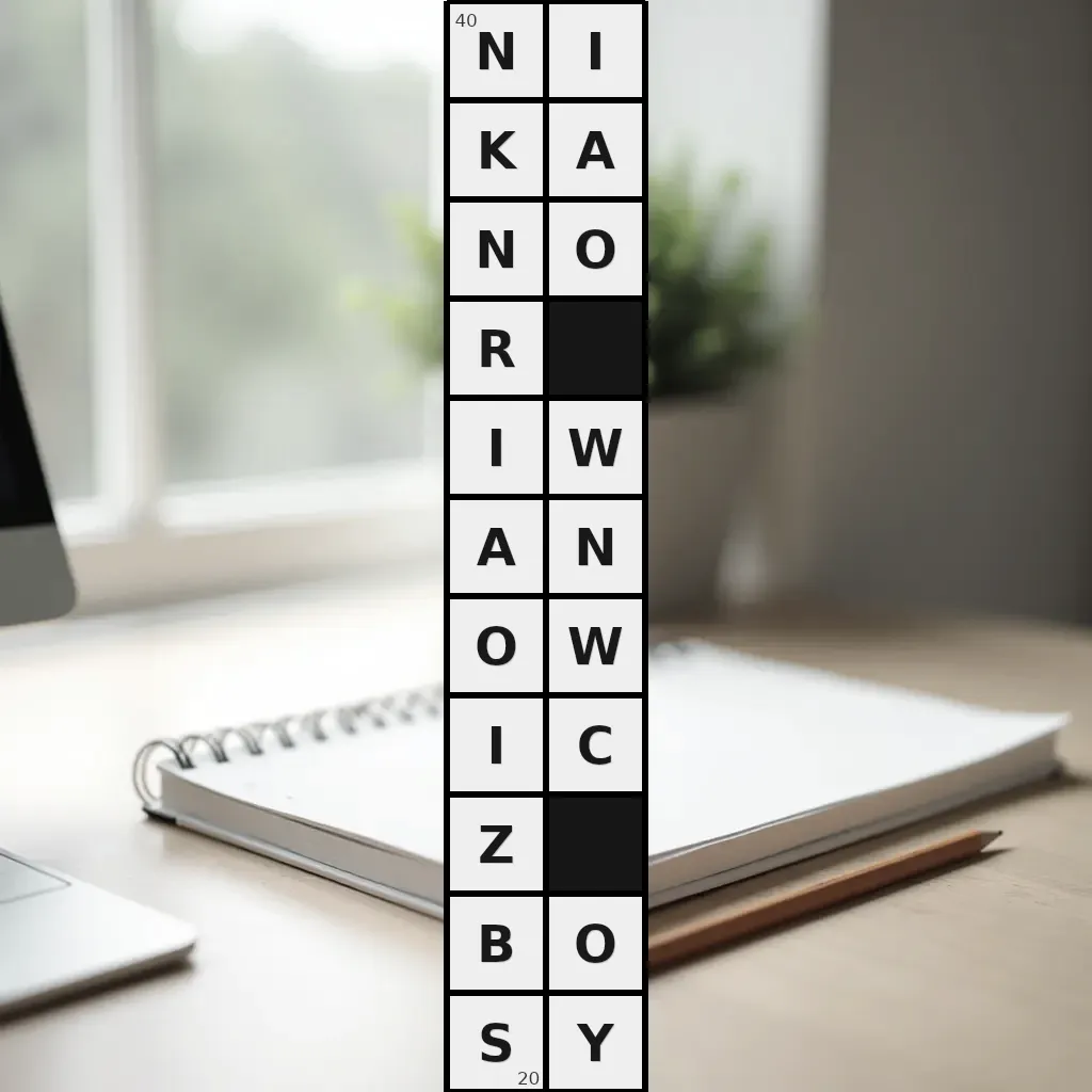 Zawiera litery: A, A, B, C, I, I, I, K, N, N, N, O, O, O, R, S, W, W, Y, Z