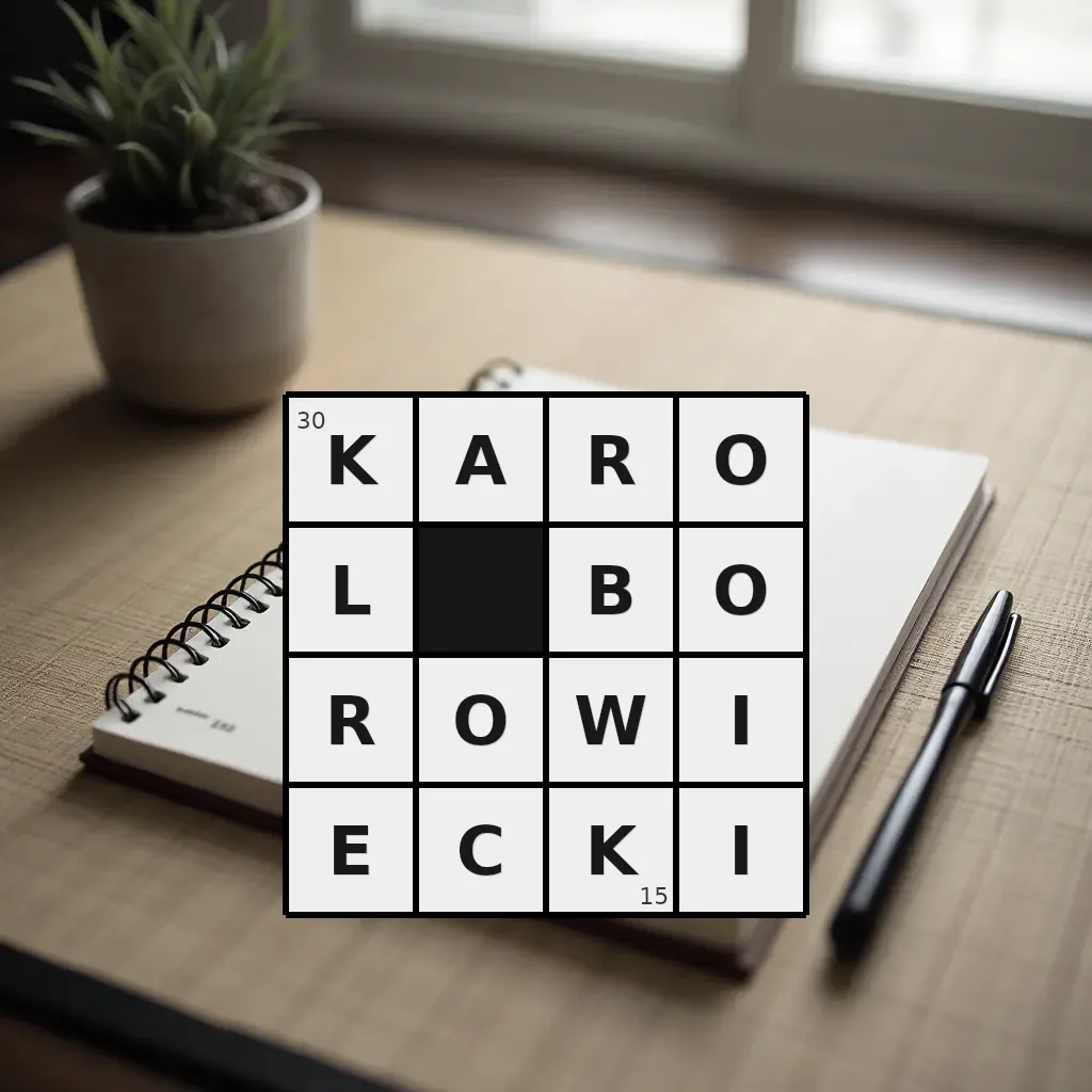Słowo „karol borowiecki” ma 15 znaków (bez spacji i łączników).