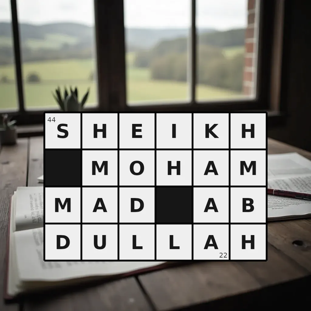 Słowo „sheikh mohammad abdullah” ma 22 znaki (bez spacji i łączników).
