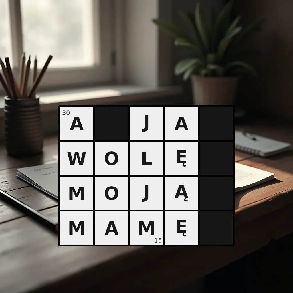 Zawiera litery: A, A, A, J, J, L, M, M, M, O, O, W, Ą, Ę, Ę
