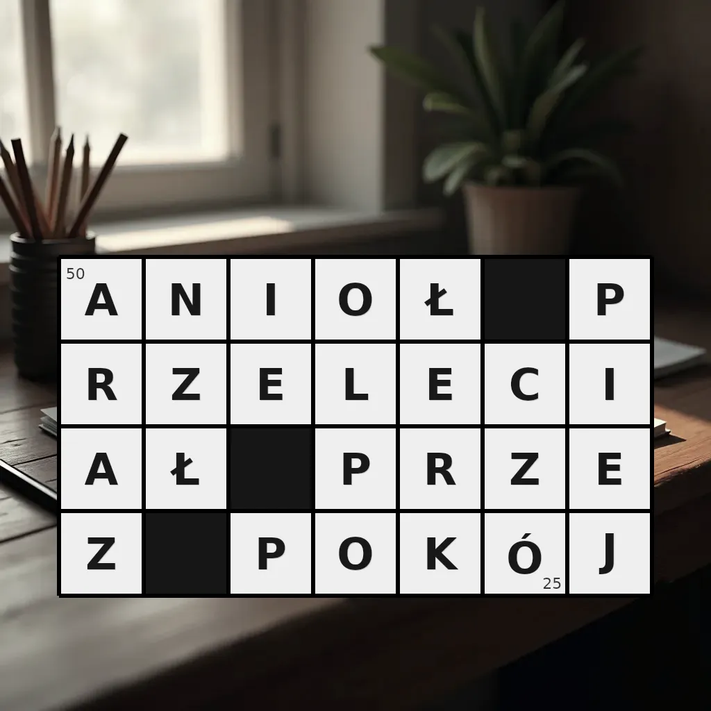 Słowo „anioł przeleciał przez pokój” ma 25 znaków (bez spacji i łączników).