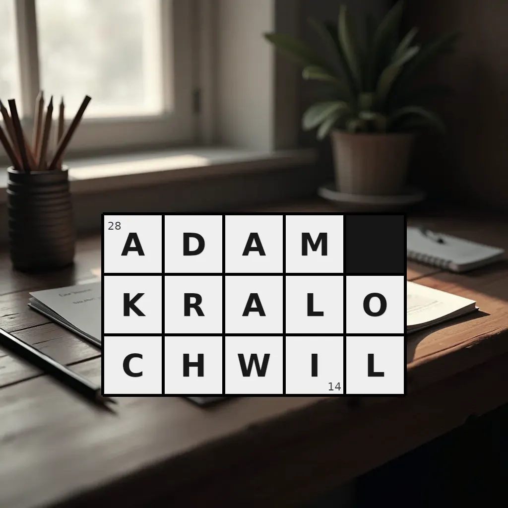 Słowo „adam kralochwil” ma 14 znaków (bez spacji i łączników).