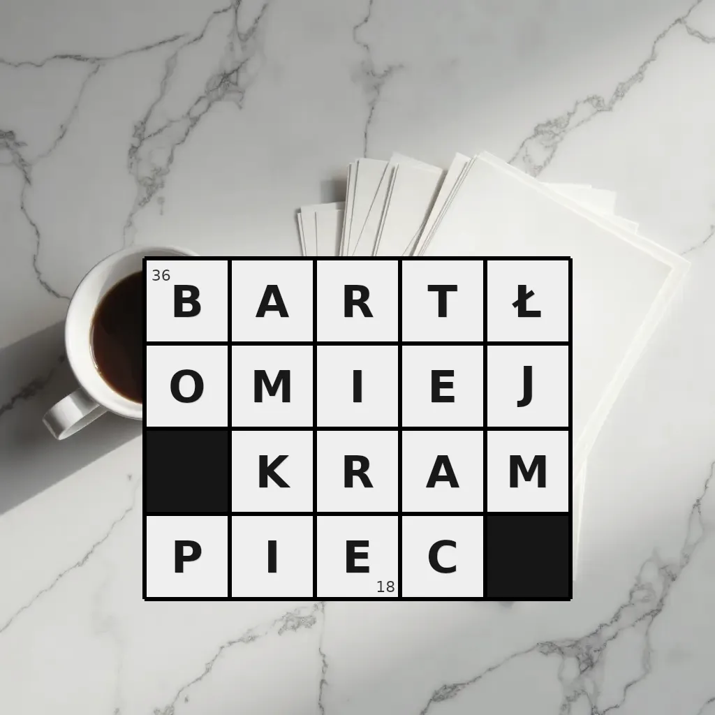 Słowo „bartłomiej krampiec” ma 18 znaków (bez spacji i łączników).