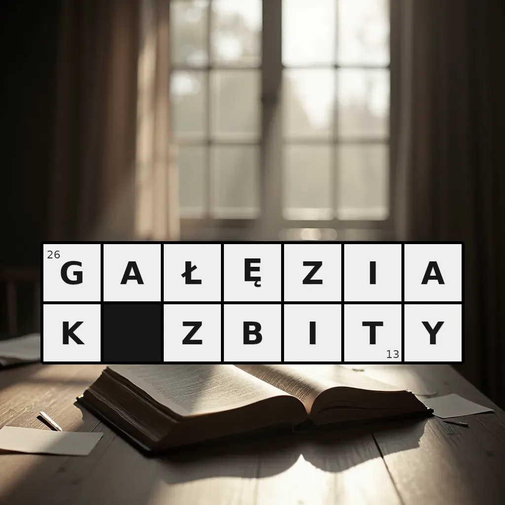 Słowo „gałęziak zbity” ma 13 znaków (bez spacji i łączników).