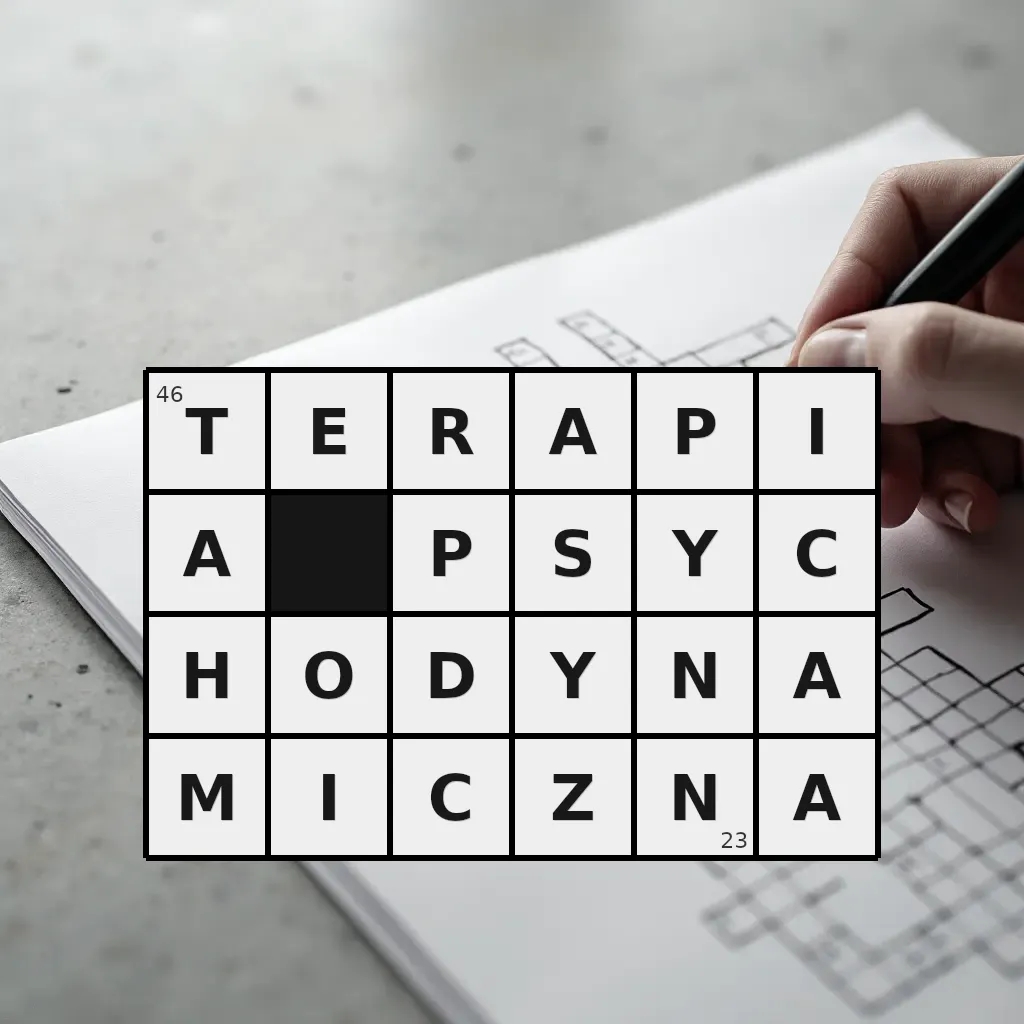 Słowo „terapia psychodynamiczna” ma 23 znaki (bez spacji i łączników).