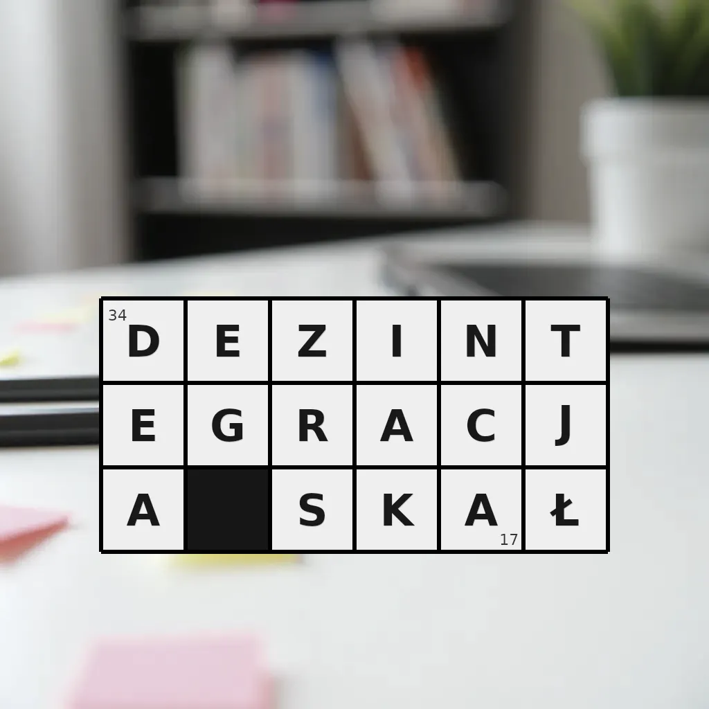 Słowo „dezintegracja skał” ma 17 znaków (bez spacji i łączników).