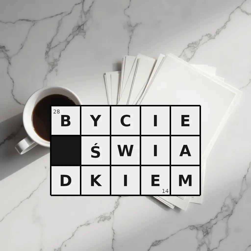 Słowo „bycie świadkiem” ma 14 znaków (bez spacji i łączników).