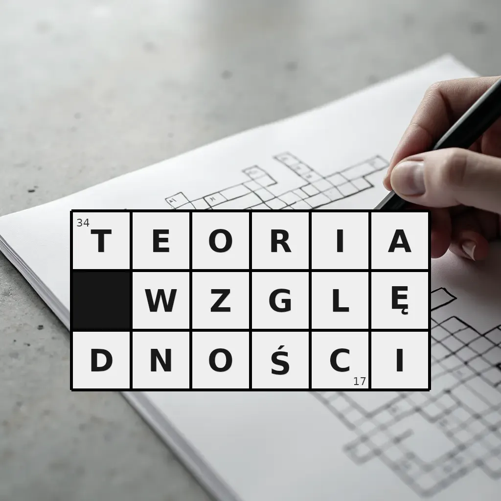 Słowo „teoria względności” ma 17 znaków (bez spacji i łączników).