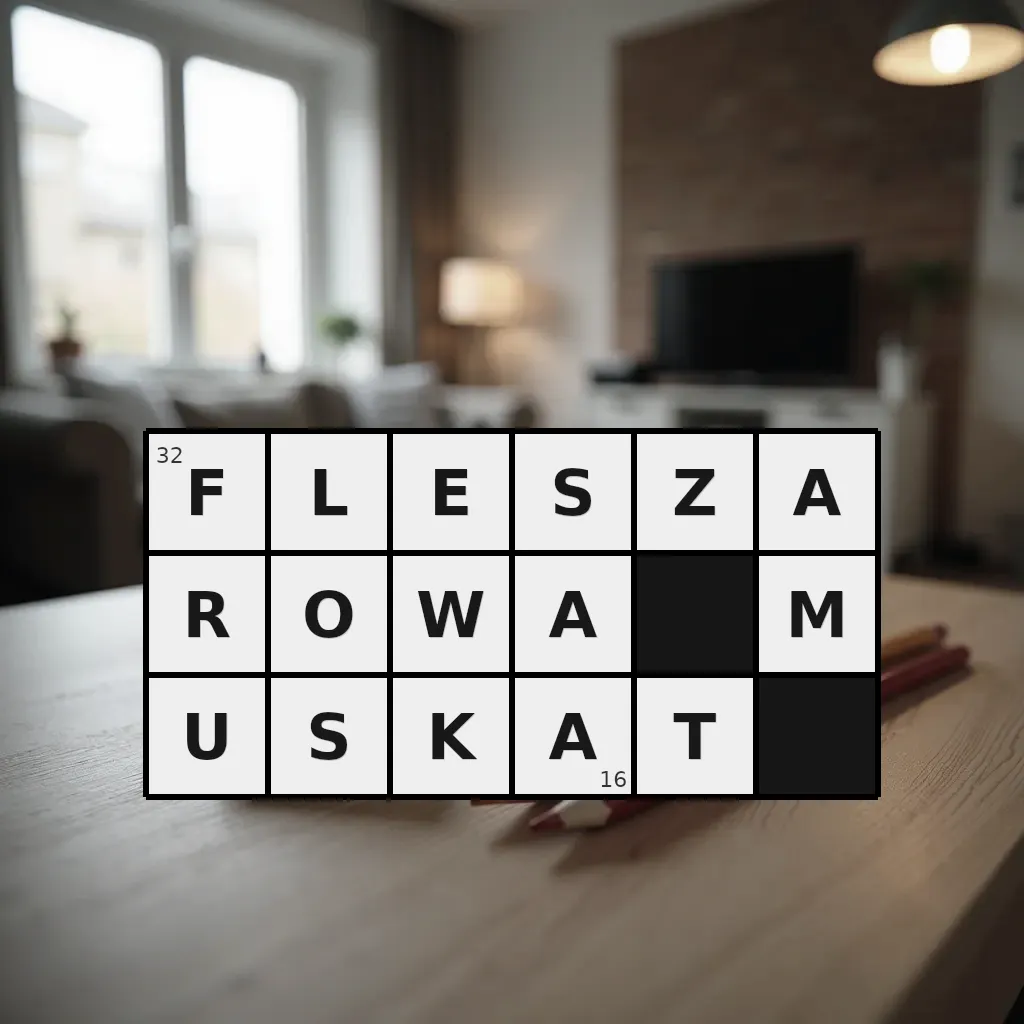 Słowo „fleszarowa-muskat” ma 16 znaków (bez spacji i łączników).