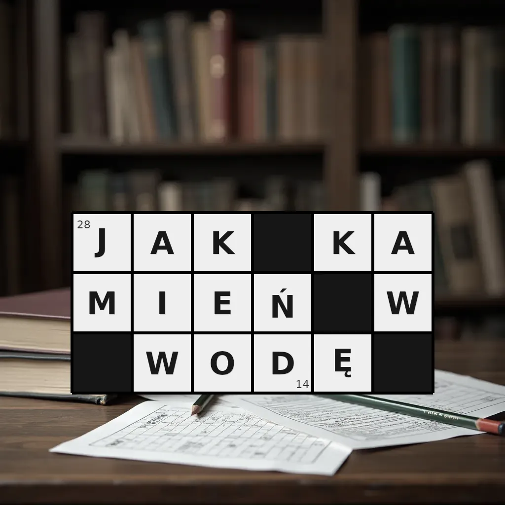 Słowo „jak kamień w wodę” ma 14 znaków (bez spacji i łączników).
