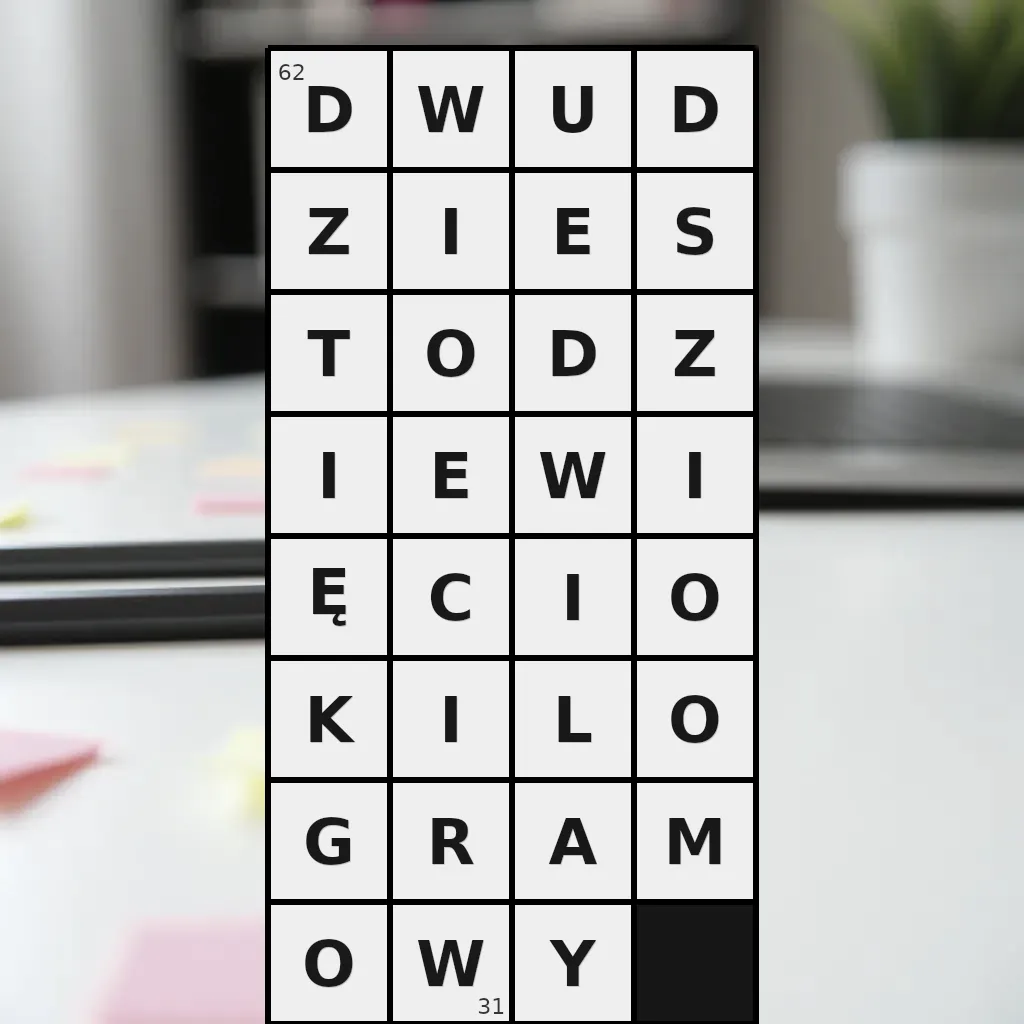Słowo „dwudziestodziewięciokilogramowy” ma 31 znak (bez spacji i łączników).