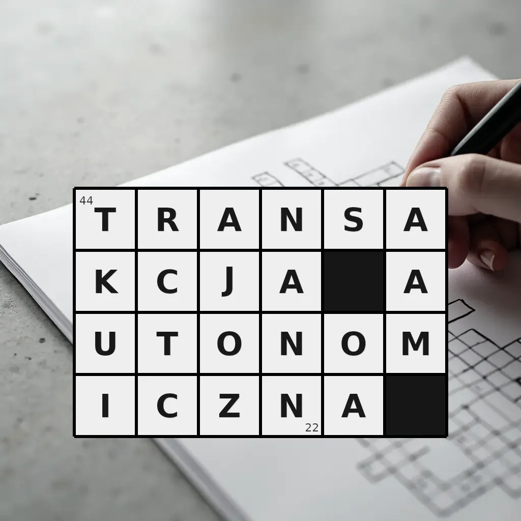 Słowo „transakcja autonomiczna” ma 22 znaki (bez spacji i łączników).