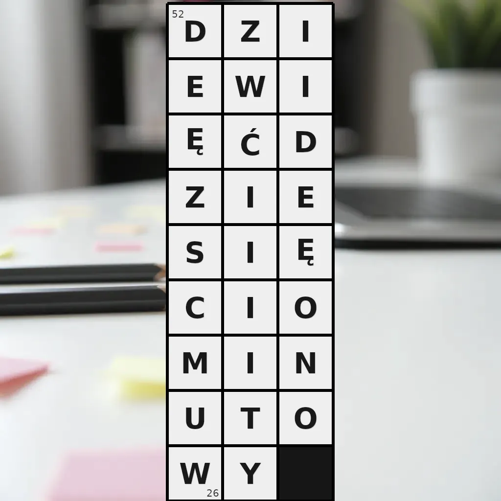Słowo „dziewięćdziesięciominutowy” ma 26 znaków (bez spacji i łączników).