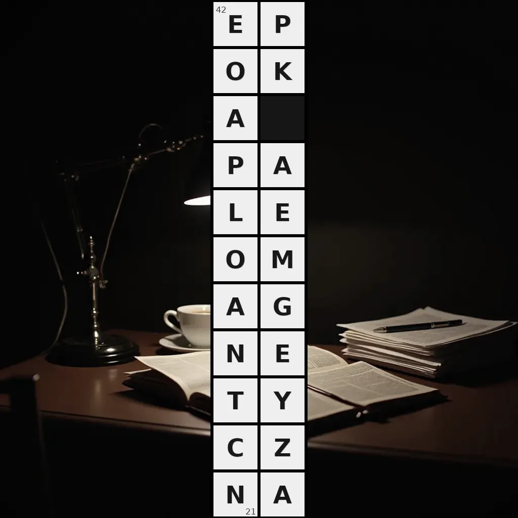 Zawiera litery: A, A, A, A, C, E, E, E, G, K, L, M, N, N, O, O, P, P, T, Y, Z