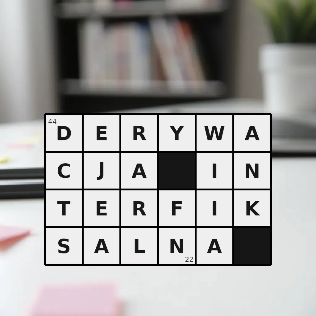 Zawiera litery: A, A, A, A, C, D, E, E, F, I, I, J, K, L, N, N, R, R, S, T, W, Y