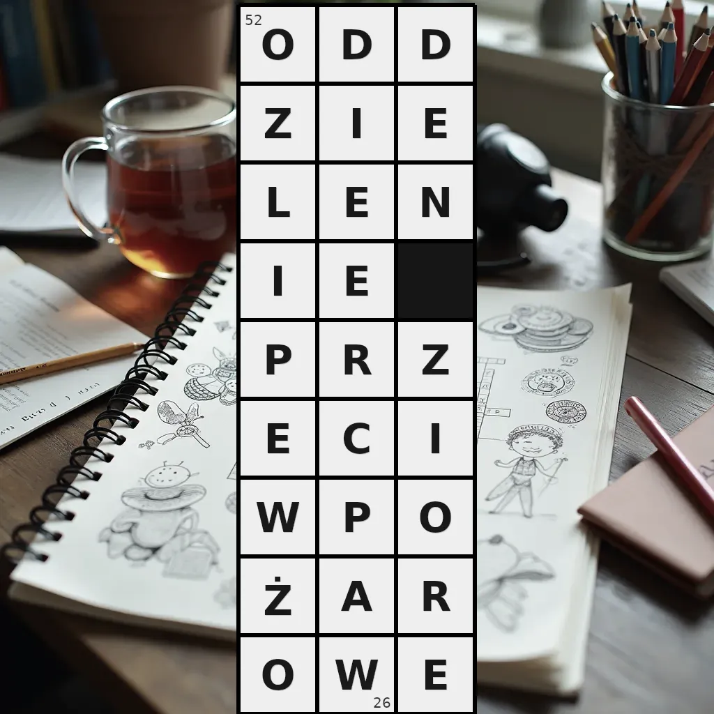 Słowo „oddzielenie przeciwpożarowe” ma 26 znaków (bez spacji i łączników).