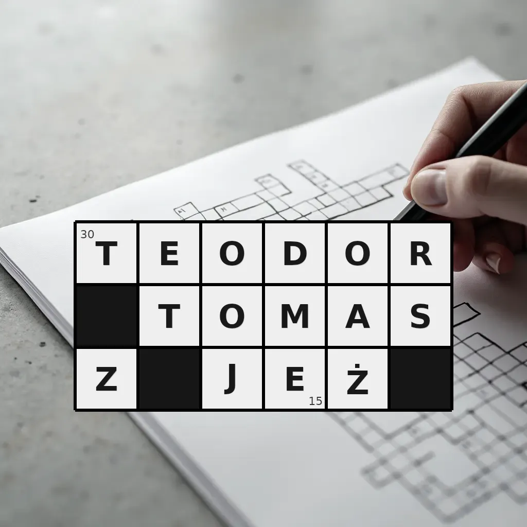Słowo „teodor tomasz jeż” ma 15 znaków (bez spacji i łączników).