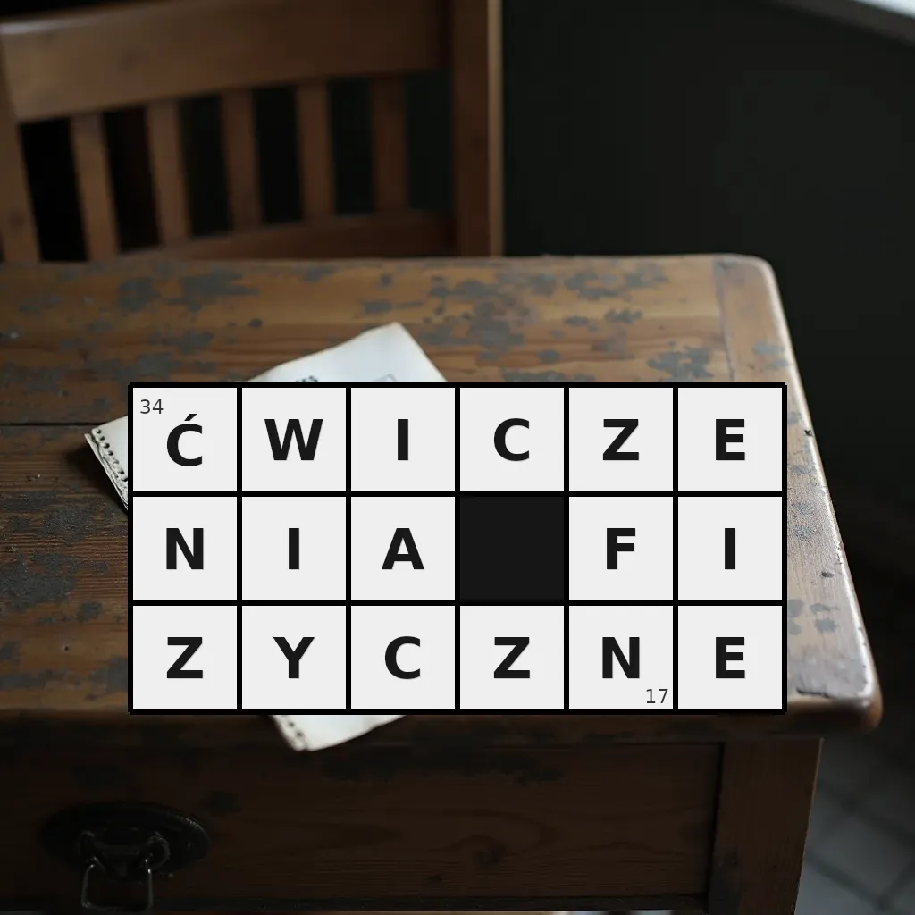 Słowo „ćwiczenia fizyczne” ma 17 znaków (bez spacji i łączników).