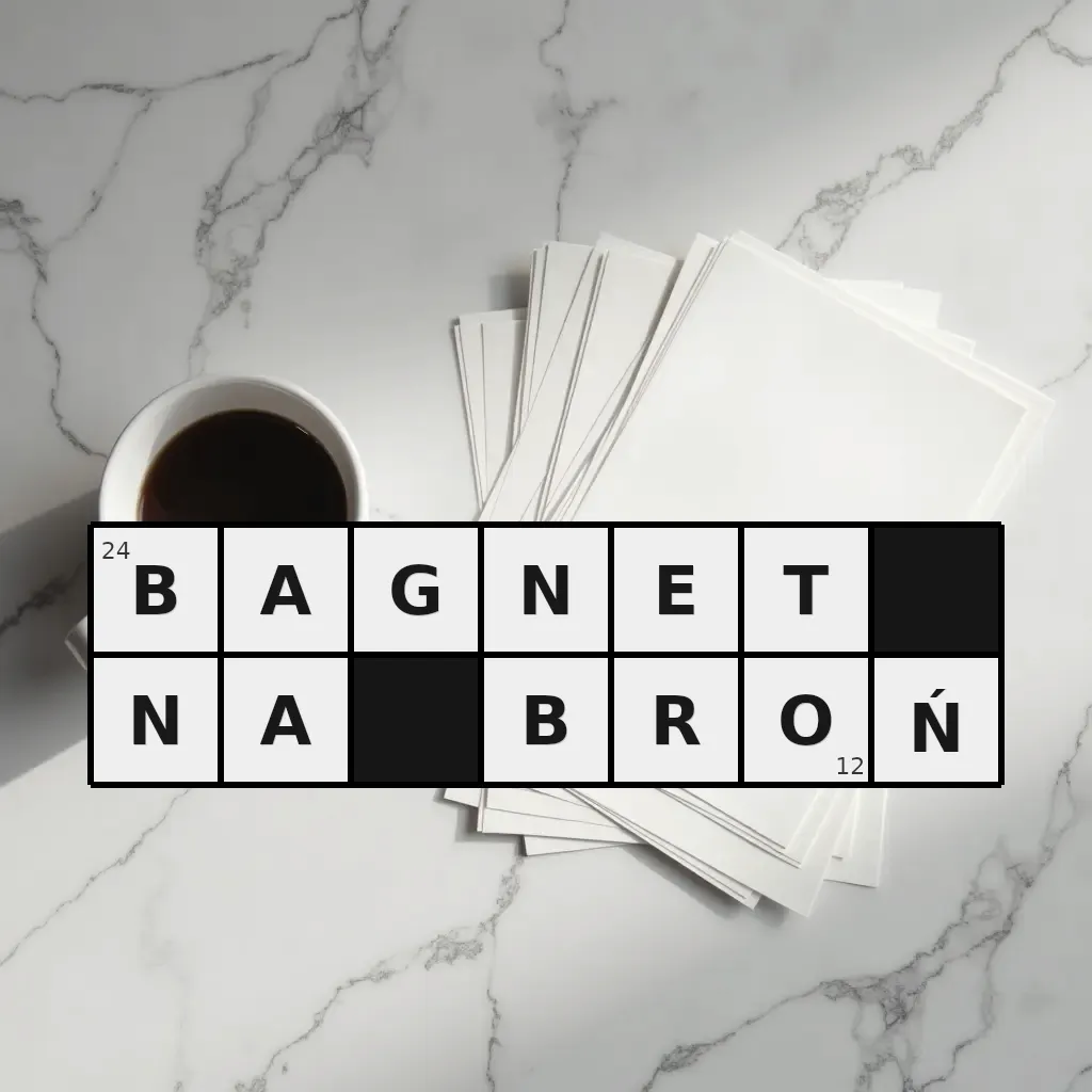 Słowo „bagnet na broń” ma 12 znaków (bez spacji i łączników).