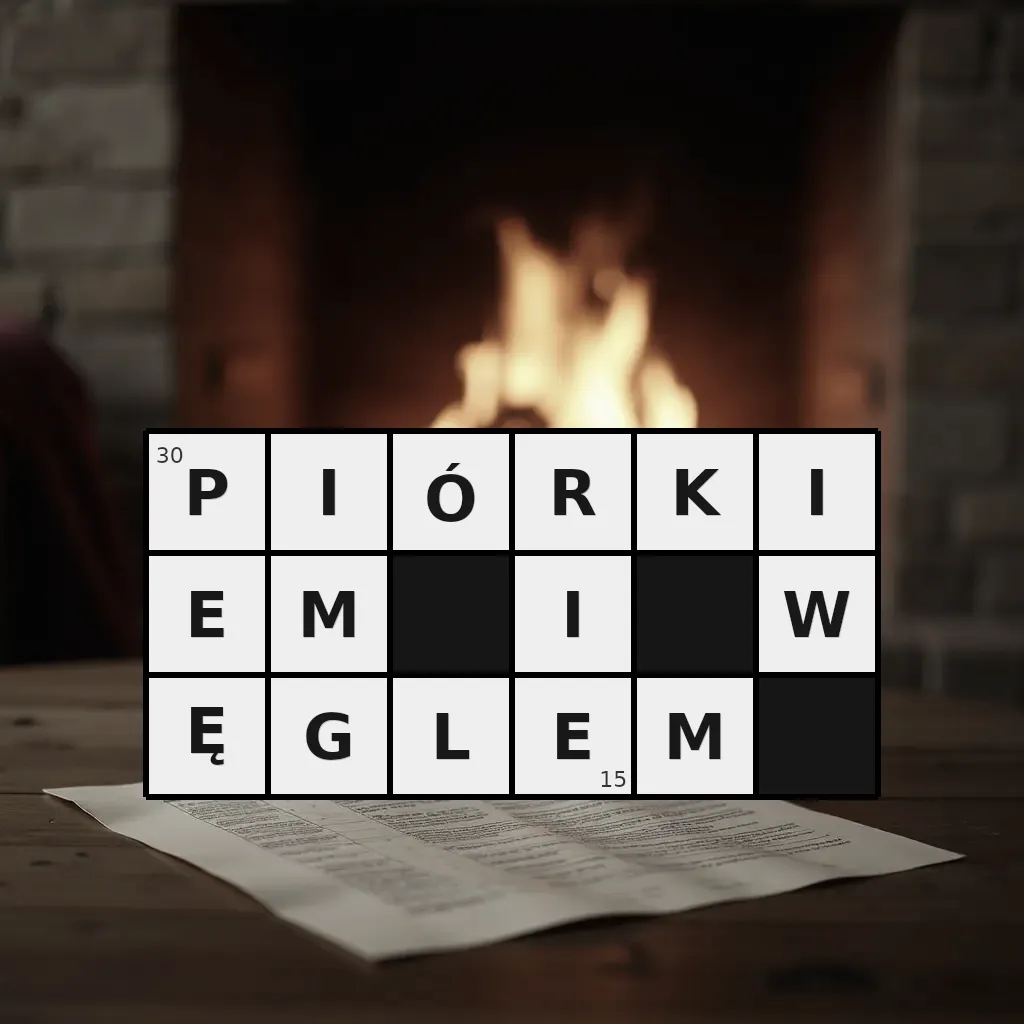 Słowo „piórkiem i węglem” ma 15 znaków (bez spacji i łączników).