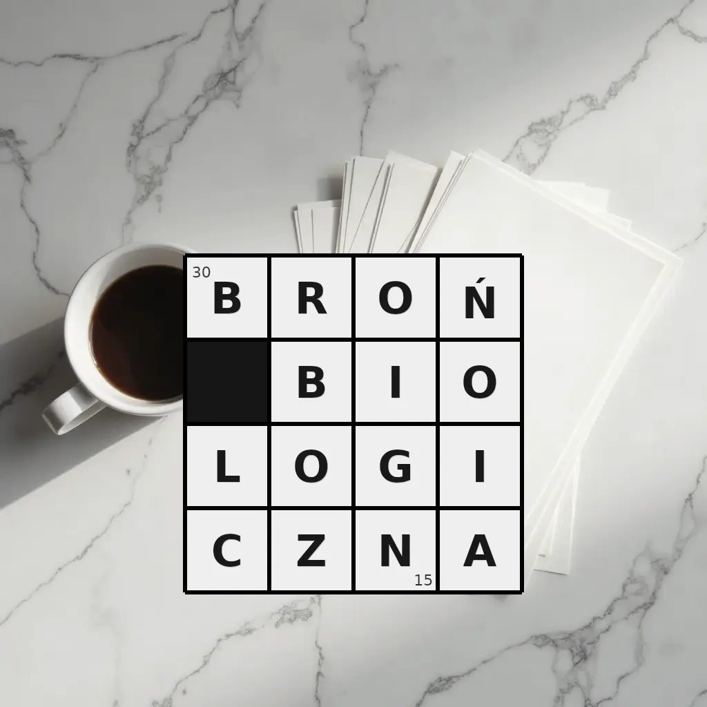 Słowo „broń biologiczna” ma 15 znaków (bez spacji i łączników).