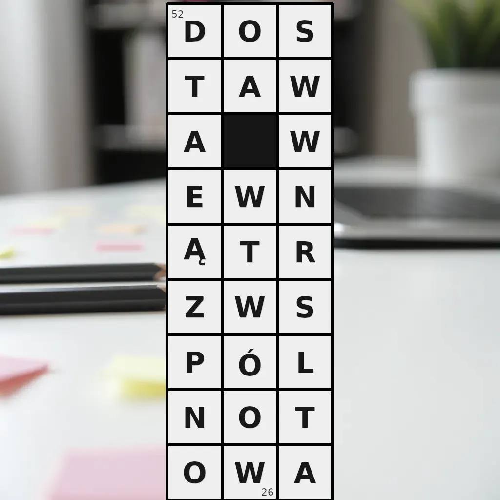 Zawiera litery: A, A, A, D, E, L, N, N, O, O, O, P, R, S, S, T, T, T, W, W, W, W, W, Z, Ó, Ą