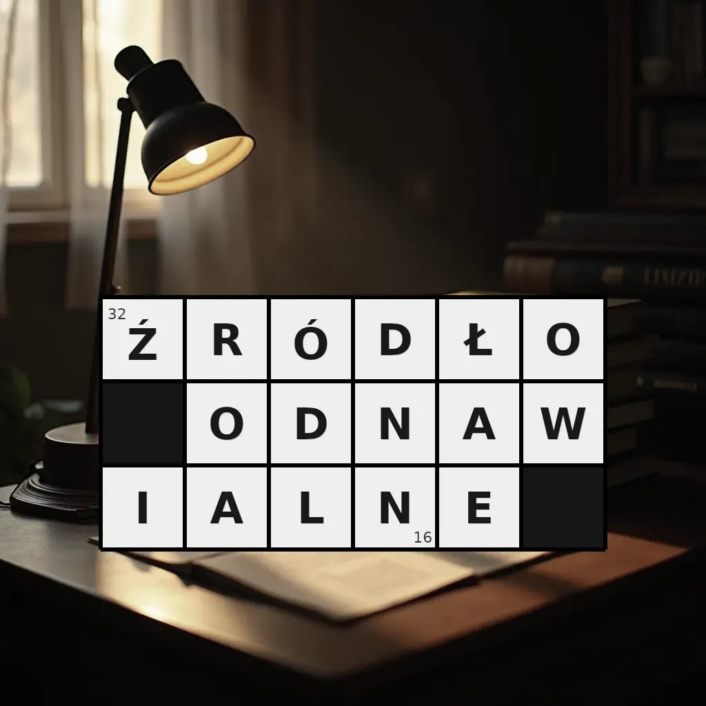Słowo „źródło odnawialne” ma 16 znaków (bez spacji i łączników).